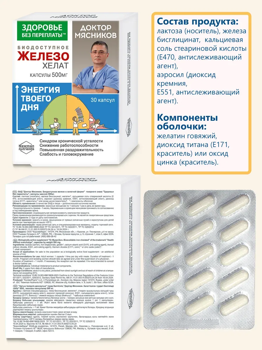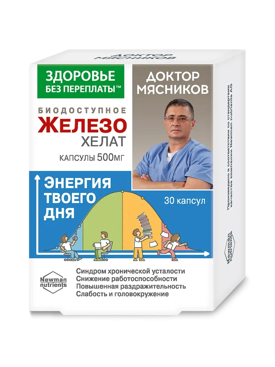 Биодоступное железо в хелатной форме — это усовершенствованный вариант минеральной добавки, созданный для эффективного восполнения дефицита железа. Хелатная форма (железа бисглицинат) отличается мягким воздействием на ЖКТ и высокой усвояемостью. Железо — ключевой элемент в построении гемоглобина, работе ферментов и энергообмена, а также в поддержании нормального функционирования гормональной, иммунной и нервной систем.