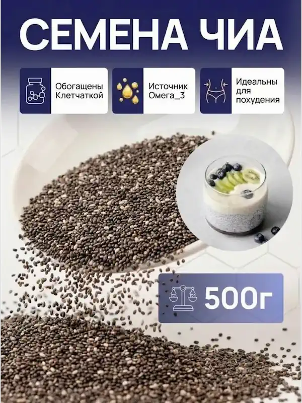 Семена чиа — это натуральный продукт с высокой питательной ценностью. Они богаты растительным белком, клетчаткой, полезными жирными кислотами и микроэлементами. Благодаря нейтральному вкусу семена легко добавлять в повседневный рацион.